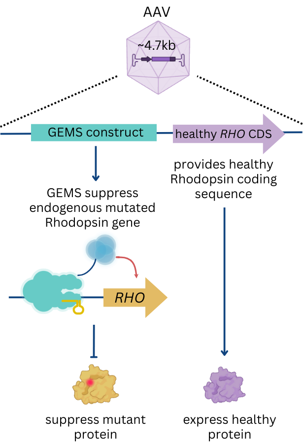 EPI-141 utilizes a “suppress and replace” strategy that simultaneously blocks mutated rhodopsin gene expression (suppress) while at the same time provides the healthy rhodopsin DNA sequence to produce a normal version of rhodopsin protein (replace), all delivered in a single AAV vector. Epicrispr’s technology and approach enables us to develop a single dose all-in-one mutation-agnostic treatment that can benefit the entire RP4 population.